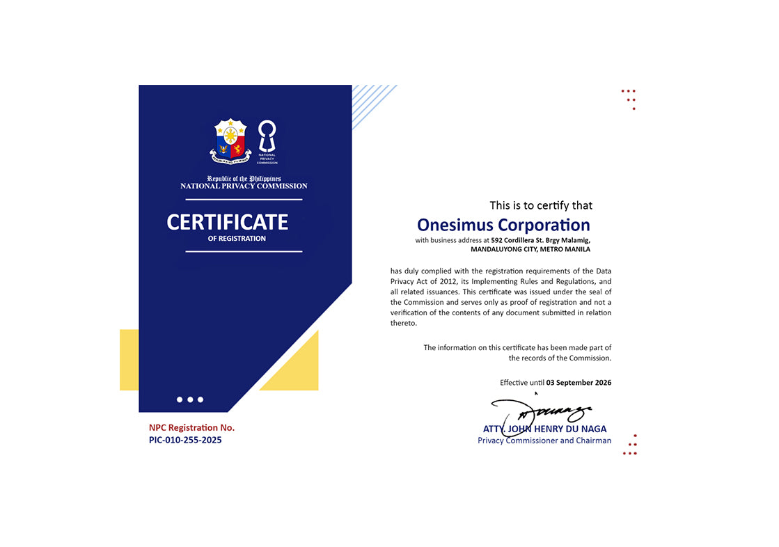 This Data Privacy Policy (“Policy”) sets out the basis which Onésimus Corporation (‘we”, “us”, or “our”) may collect, use, disclose or otherwise process personal data of our customers in accordance with the Data Privacy Act of 2012 (“DPA”). This Policy applies to personal data in our possession or under our control, including personal data in the possession of organizations which we have engaged to collect, user, disclose or process personal data for our purposes.