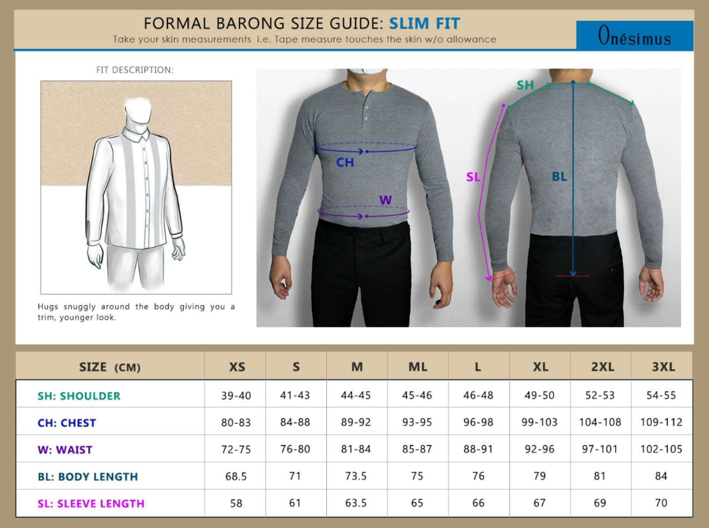 This Onésimus exquisitely tailored Formal Barong stands out with Coat-style sleeves and body fit. It has elegant Yakan pattern print and handcrafted covered buttons.